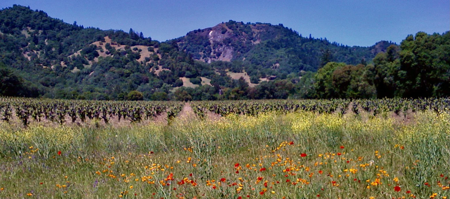 Spring time at Caballo Blanco Vineyard in a rounded hidden valley in the hills between the Anderson Valley and Ukiah Valley.