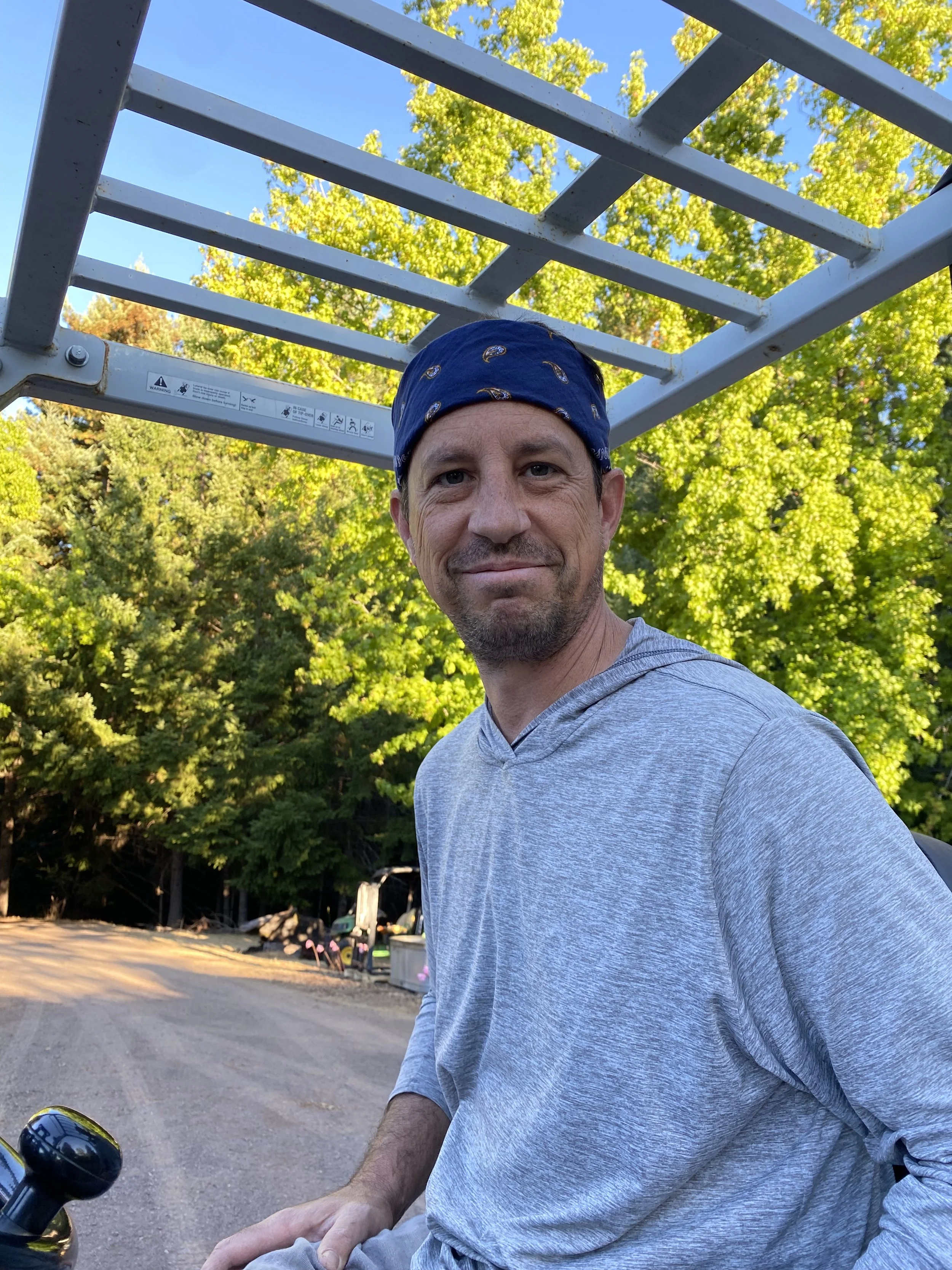 Phillip Baxter rocks a bandana while being a fork lift cowboy.