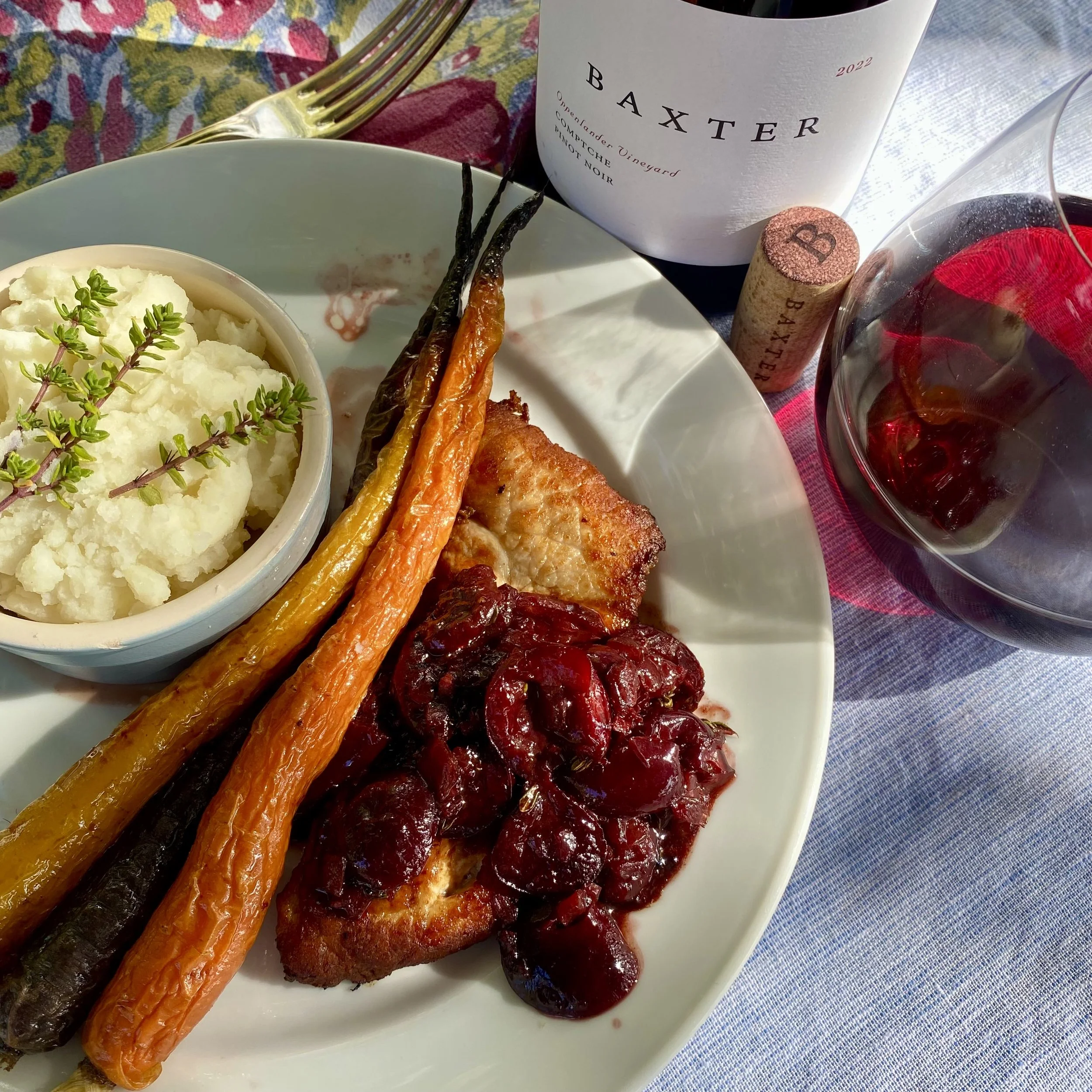 This warming pork dish makes an ideal companion to our 2021 Caballo Blanco Vineyard Carignan. It’s inspiration comes from our home’s surroundings: the thyme just outside the kitchen door, as well as the neighbor’s cherries that are so plentiful in the summer we end up freezing some to enjoy in the Fall and Winter months. We initially tried this recipe with the Oppenlander Pinot, but it’s definitely best as a Carignan pairing - the sauce really echoes the cherry pop of the Carignan!