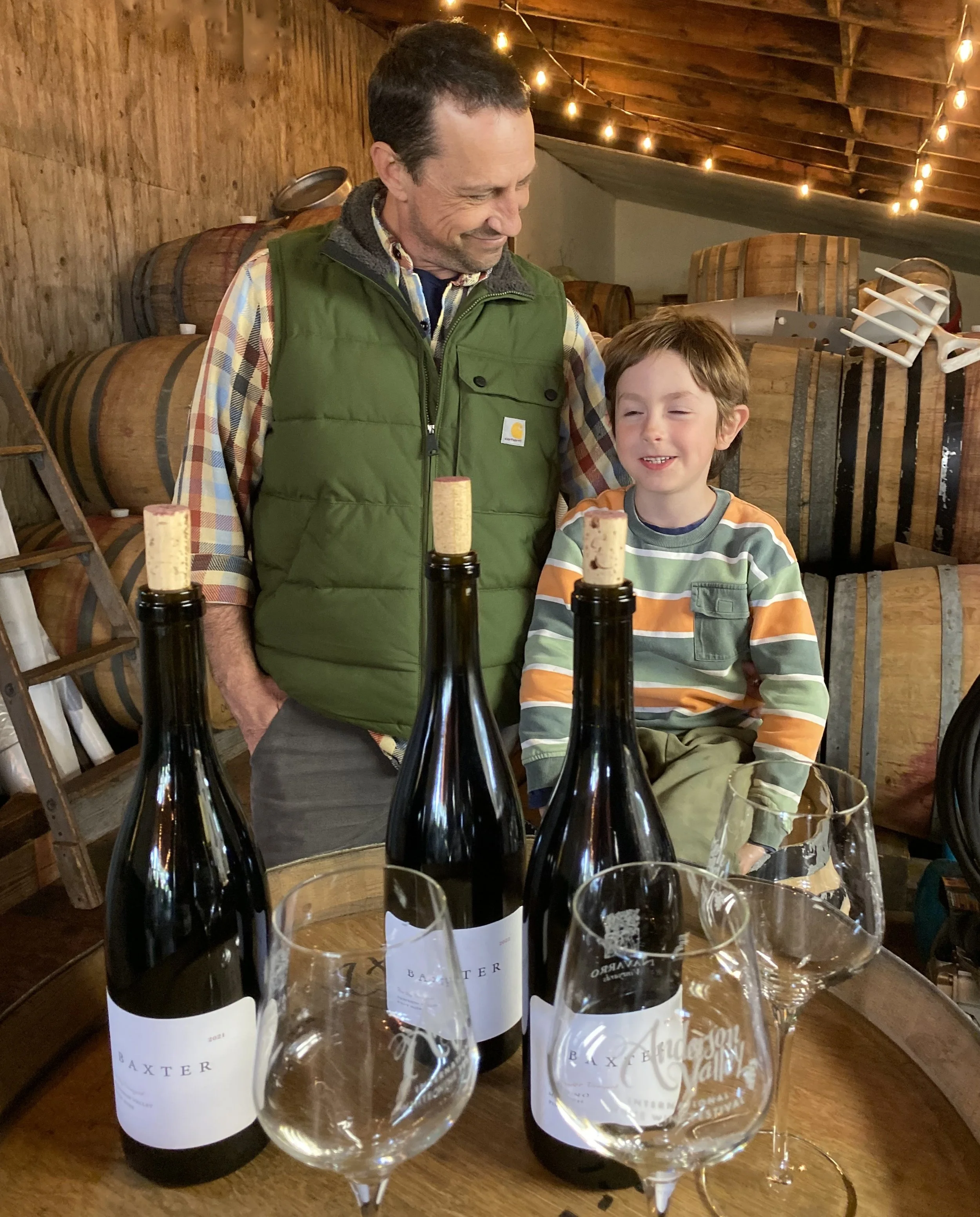 Winemaker Phillip with our budding winemaker keeping his dad company in the Baxter Winery barrel cellar.